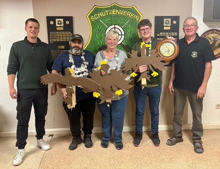 Bei den Jugendlichen fiel der Adler nach 118 Schuss und Ben Bernhardt ist neuer Jugendkönig. Bei den Damen holte mit dem 168. Schuss Gisela Mendler den Adler von der Stange und wurde Schützenkönigin.